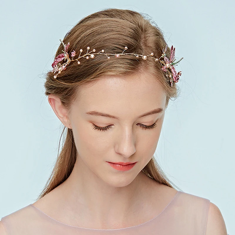 handmade pink dragonfly headpiece pearls wedding headband boho bridal hair jewelry for girls women hair band