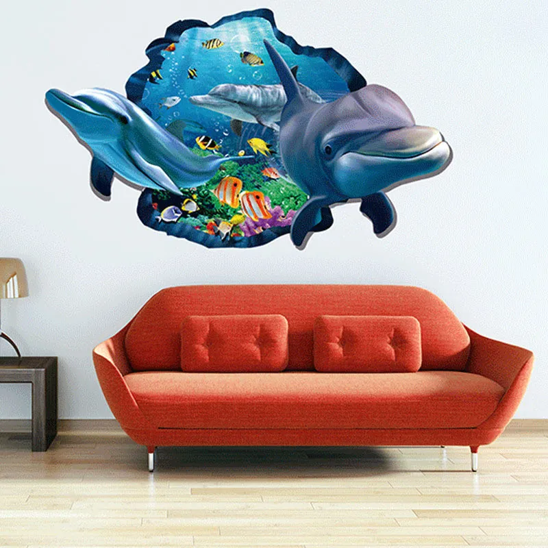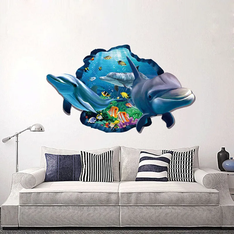 Underwater Fish Dolphin 3d Vivid Window Wall Stickers DIY PVC Wall decals Bathroom Living Room Bedroom Home Decoration Poster